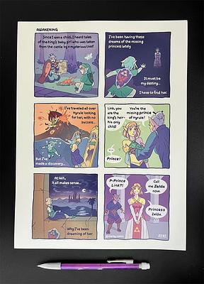 Print of Awakening comic by Alienby Comics. What if Link and Zelda were one and the same? Printed on 80 lbs uncoated stock (12 x 9 in. /30.48 x 22.86 cm)