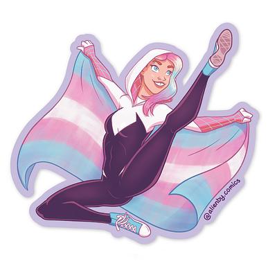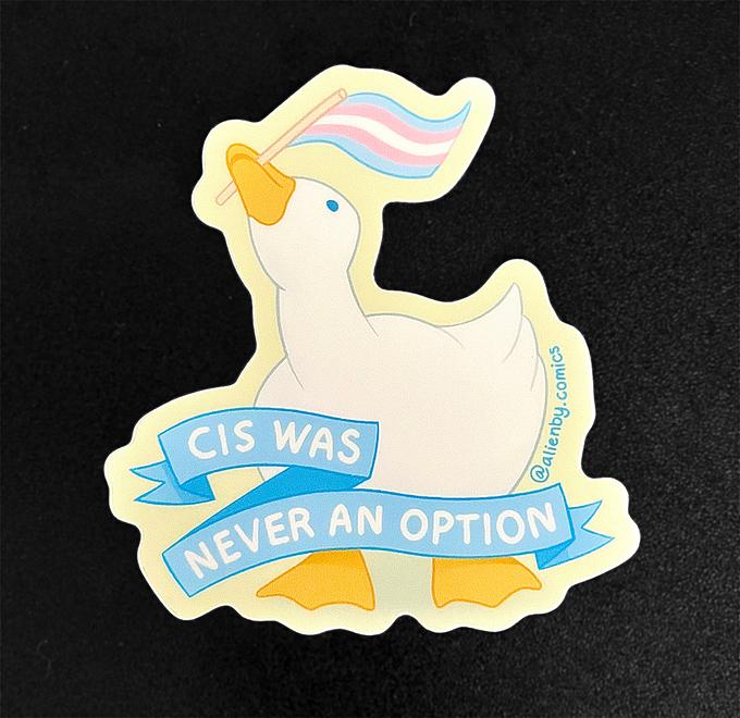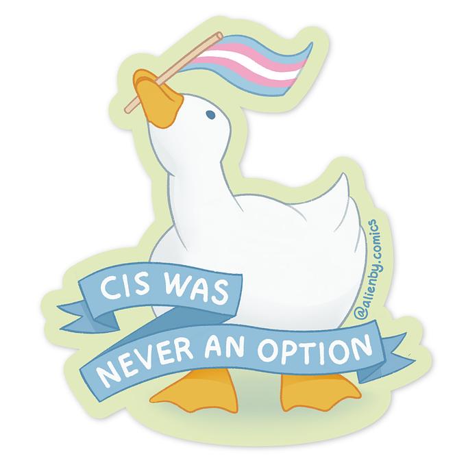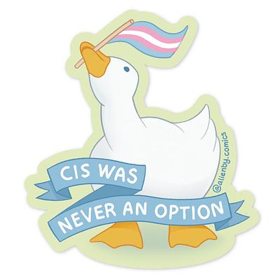 Sticker of a goose triumphantly waving a trans flag with the caption "Cis was never an option" Sticker with original artwork by Alienby Comics Waterproof matte vinyl sticker (2.75 x 3 in / 6.985 x 7.62 cm)