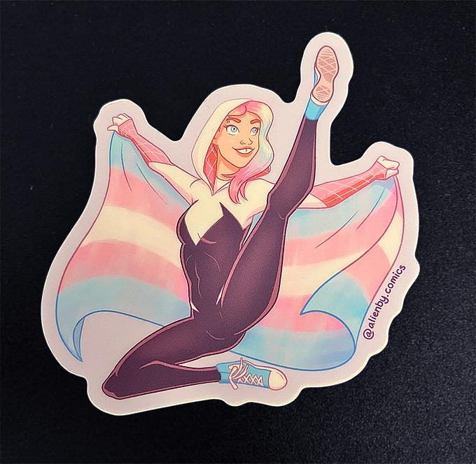 Sticker of Gwen leaping with a trans flag. Sticker inspired by the comic "In Full Swing" by Alienby Comics Waterproof matte vinyl sticker (3.75 x 3.35 in / 9.525 x 8.5 cm)