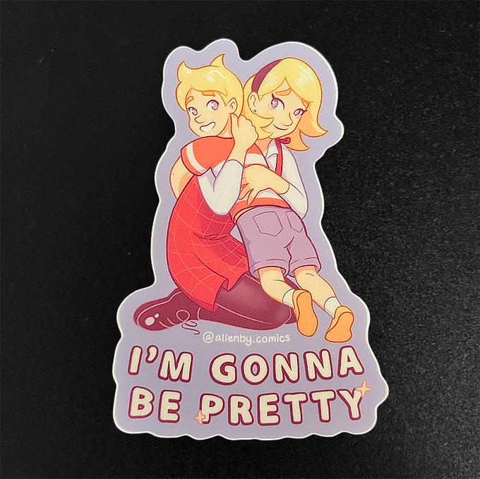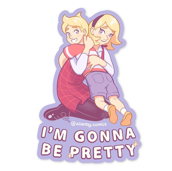 Sticker of me hugging my inner child with the caption "I'm Gonna Be Pretty." This sticker is based on the comic "Meeting My Past Selves" by Alienby Comics Waterproof matte vinyl sticker (2.5 x 3.75 in / 6.35 x 9.525 cm)