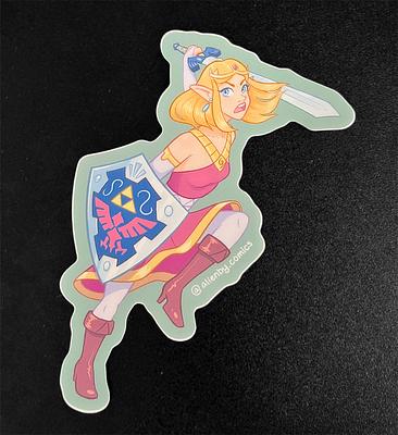 Sticker of legendary princess wielding a sword and shield This sticker is based on the comic "Awakening" by Alienby Comics Waterproof matte vinyl sticker (3 x 4 in / 7.62 x 10.16 cm)