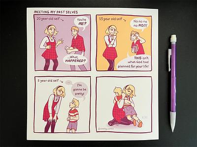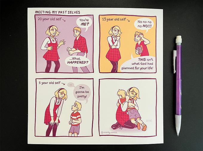 Print of Meeting My Past Selves comic by Alienby Comics. A reminder to listen to your inner child! Printed on 80 lbs uncoated stock (8 x 8 in. / 20.32 x 20.32 cm)