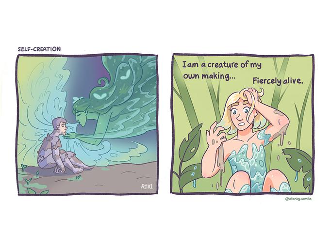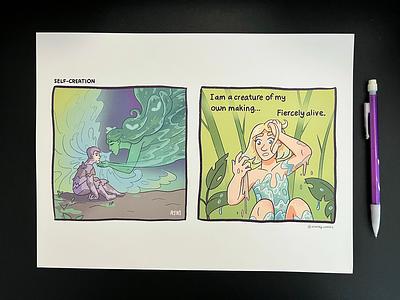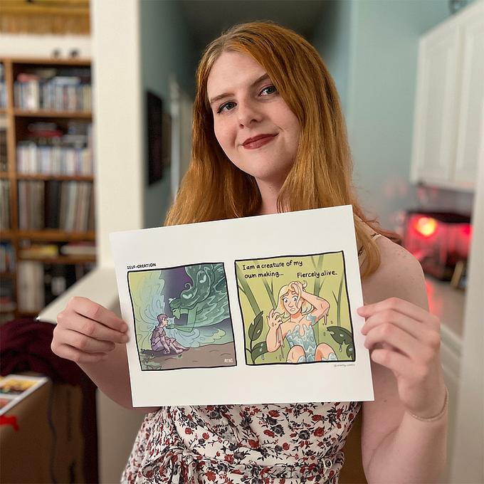 Print with a couple panels from Self-Creation comic by Alienby Comics. Dedicated to the beautiful spiritual nature of being trans Printed on 80 lbs uncoated stock (9 x 12 in. / 22.86 x 30.48 cm)